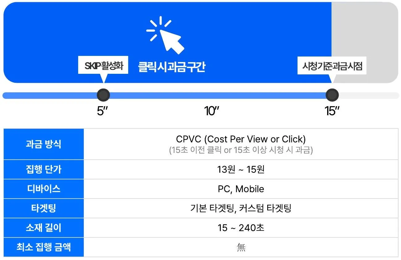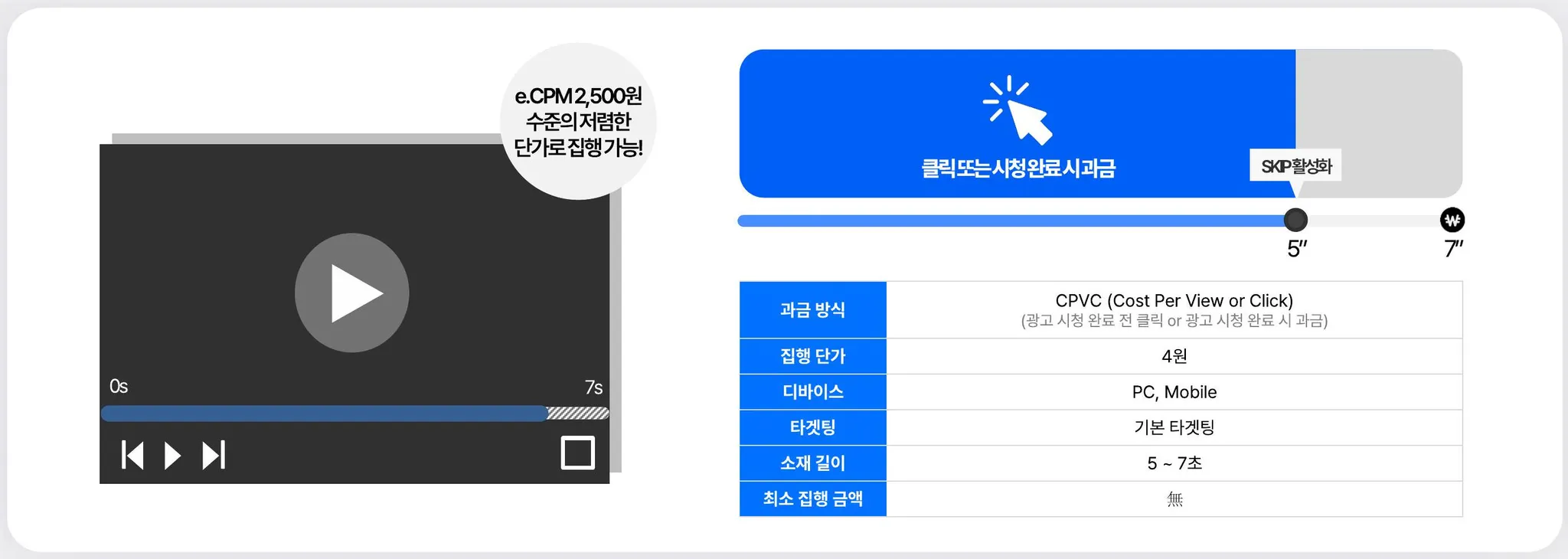 PC 및 Mobile 광고의 경우 15 초 스킵 프리롤로 송출되며, 노출 기준 과금됩니다.