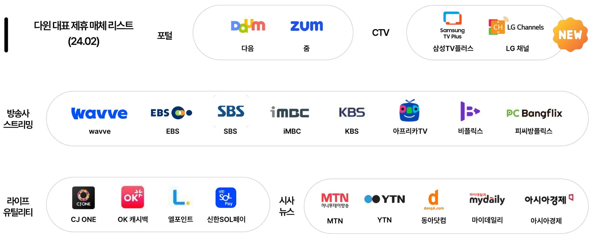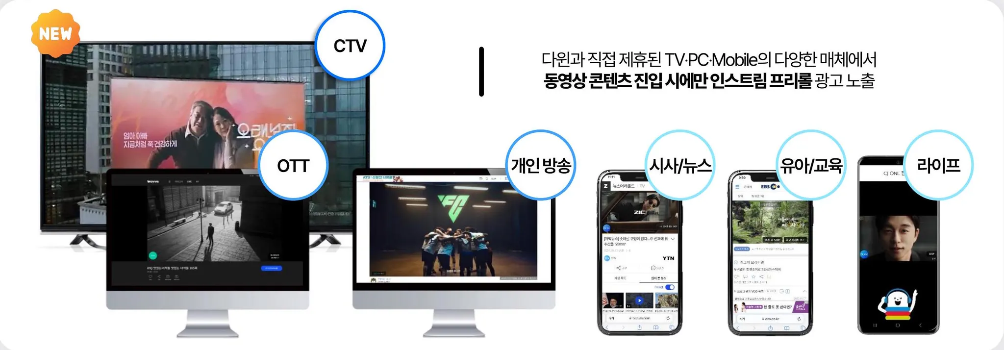 아웃스트림 위주의 노출이 아닌, 다원은 50 여 개 국내 프리미엄 매체의 인스트림 지면에 노출되어 광고 주목도 확보가 가능합니다.
